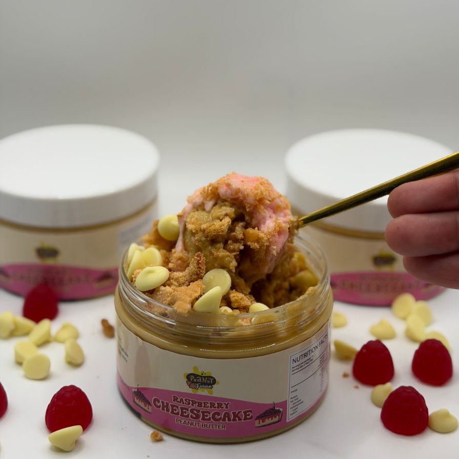 Indulge in dessert heaven with our Raspberry Cheesecake Peanut Butter — a luscious blend that tastes like a slice of cheesecake in every spoonful. We start with our smooth white chocolate peanut butter base, then swirl in layers of rich raspberry cream cheese for that creamy, tangy twist. Each jar is loaded with melty white chocolate chips and chunks of raspberry shortbread biscuit, creating the perfect balance of sweet, tart, and buttery crunch.